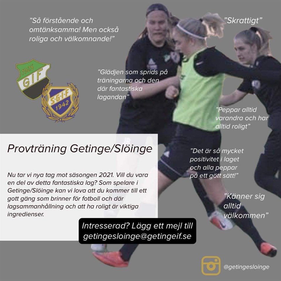 Vill du tillhöra världens goaste gäng? Getinge/Slöinges damlag söker kanske just dig! Hör av dig till getingeslöinge@getingeif.se för mer information. Välkomna! Getinge IF 4 feb 2021 0kommentarer