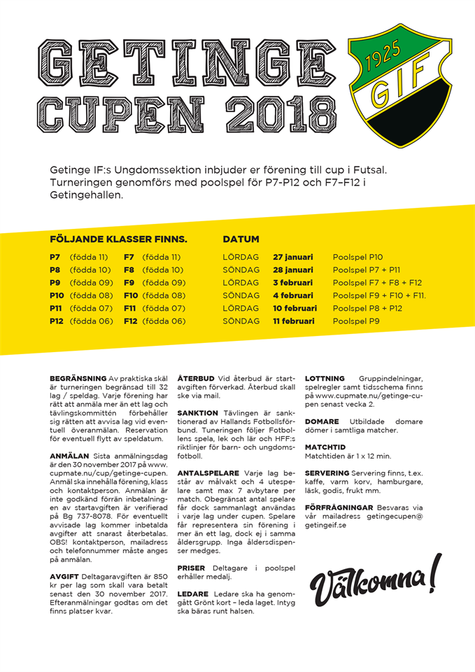 Sedan år 1984 har den populära inomhuscupen GetingeCupen spelats och nu är det dags igen. Cupen spelas som vanligt på helgerna under vecka 4,5 och 6. Anmälan görs via Cupmate. Tryck på länken för att anmäla er Anmälan GetingeCupen 2018 Hoppas vi ses! Getinge IF 9 okt 2017 0kommentarer