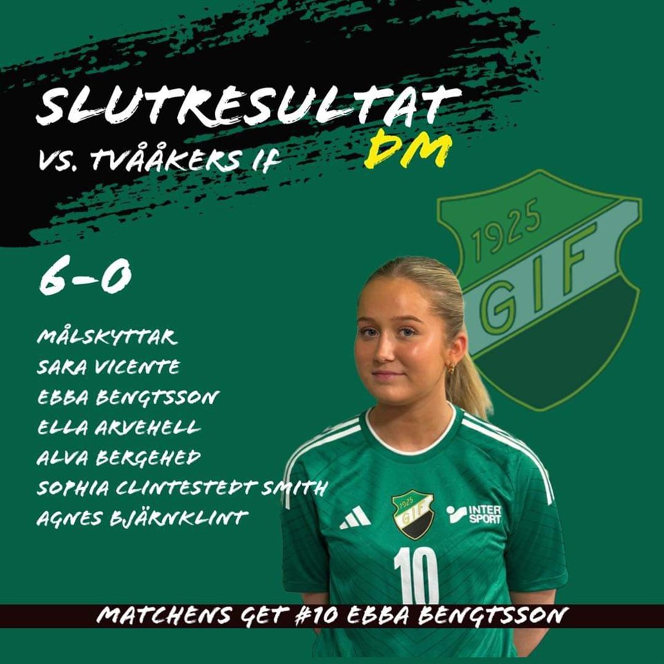 Igår kväll spelade vi vår första DM match, på ett blåsigt och kyligt Getinge IP stod Tvååker som motståndare. Matchen spelas igång och redan från start tar vi tag i taktpinnen och har majoriteten av bollinnehavet. Trots att det blir emellanåt lite slarvigt spel pga nervositet inför matchen så kontrollerar vi spelet. Agnes Bjärnklint hittar in 1-0 redan efter nio minuter via en frispark från kanten. Tvååker hotar med försök av långa bollar över vår backlinje men vi löser det med bra samspel mellan backlinjen och Maja. Vi har en del skott utanför straffområdet som inte vill sig in. Vid matchminut 28 hittar vi in 2-0 målet när Ella kyligt chippar bollen över målvakten. Strax efter gör Ebba mål efter en fin djupledspassning av Alva. Inte så långt efter det byter de roller och Alva placerar in en hörna som slogs av Ebba, 4-0. I halvlek pratar vi om att fortsätta hota med vårat offensiva spel. Försöka spela ännu mer efter spelidén. Andra halvlek drar igång och det dröjer inte många sekunder innan Sophia sätter dit 5-0. Strax efter detta kommer Sara som sätter sitt tredje mål för säsongen, 6-0. De sista 40 minuterna förblir mållösa. Men vi tar med oss väldigt mycket från denna delen av matchen ändå, här vågar vi utmana våra motståndare mer, spela svårare bollar, slå fler inlägg och testa en del skott utanför straffområdet. Matchen slutar 6-0 och tre poäng är ett faktum. Vi spelar bättre och bättre ju mer vi spelar med varandra och vi hjälper och stöttar varandra i alla situationer. Med sex olika målskyttar och ännu en hållen nolla gjorde hela laget ett fantastiskt jobb. Men med sitt slit på plan, ett mål och hela tre assister utses Ebba Bengtsson till matchens GET. Vi tackar publiken och domarna för en väl genomförd match. Nästa DM-match spelas mot Torup/Rydö FF borta på Örnvallen. //Hugo